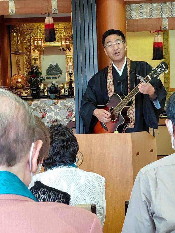『仏説阿弥陀経』や『仏説観無量寿経』の経文を丁寧に解説いただきながら、お彼岸の意味や味わいについてお話し頂きました。そして、今、生かされているご縁に感謝する言葉として、家に帰った後、ご家族などに是非伝えてほしいと紹介いただいた「あなたに会えてよかった」という言葉。ご参堂の方同士でもこの言葉を伝え合い、同じ場に集えたご縁に感謝しながら、微笑みの溢れる素敵な時間となりました。また、ご法座の最後には、老人養護施設などで演奏をされるご講師による、ギターの弾き語りがあり、ご参堂の方々も一緒に口ずさみながら、心温まる空間となりました。